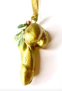 For starters, I’m putting up a tree, but not just any tree. Mine will feature not just the usual lights and sparkle, but also a tantalizing array of sexy holiday ornaments. There will be some frisky snowpeople on the tree. I might even brag that Santa came twice because I’m so good. This golden phallus might be too much for some folks, but not for me and my tree.